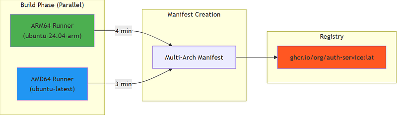 Traditional Docker multi-platform builds use QEMU emulation (10x slower). This project uses native ARM64 runners: